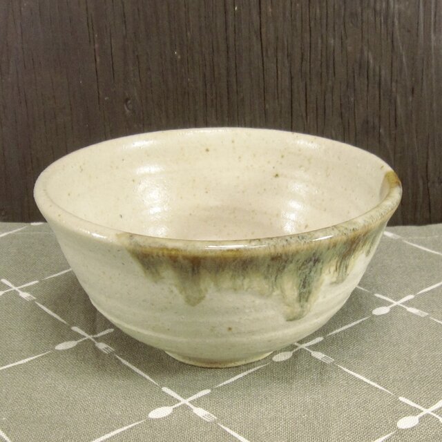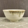 標準より大きめの,膨らみのあるご飯茶碗です.天然成分の汚れのあるベージュっぽい釉薬に,一部に茶色を垂らしました.