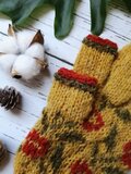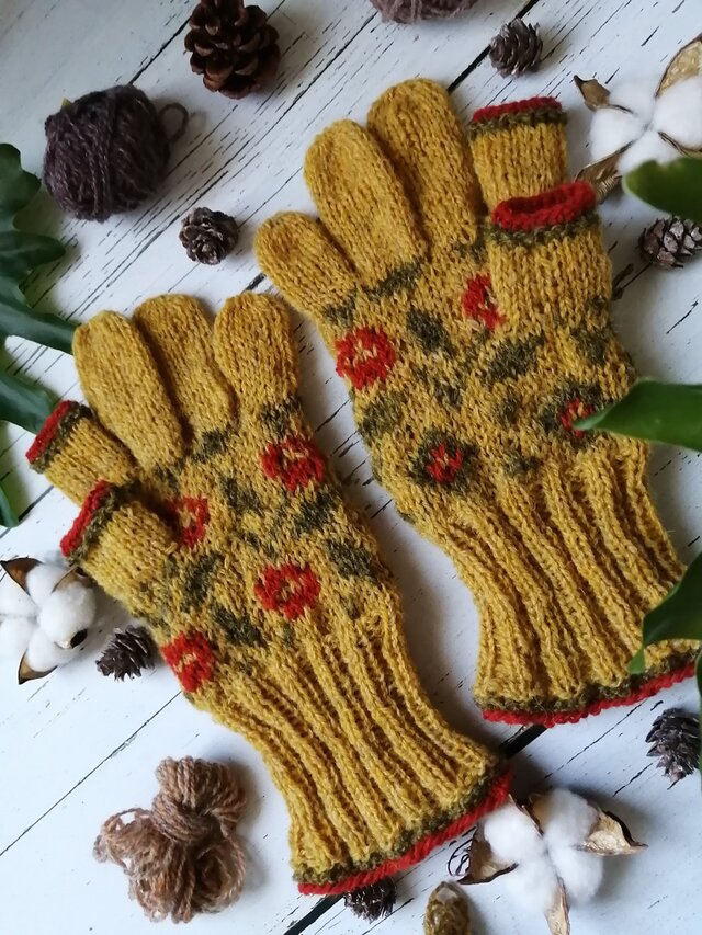 山吹色に赤の花が楽しげに咲く、編み込み模様のスマホ対応5本指手袋です。