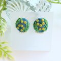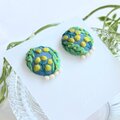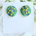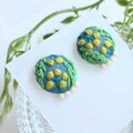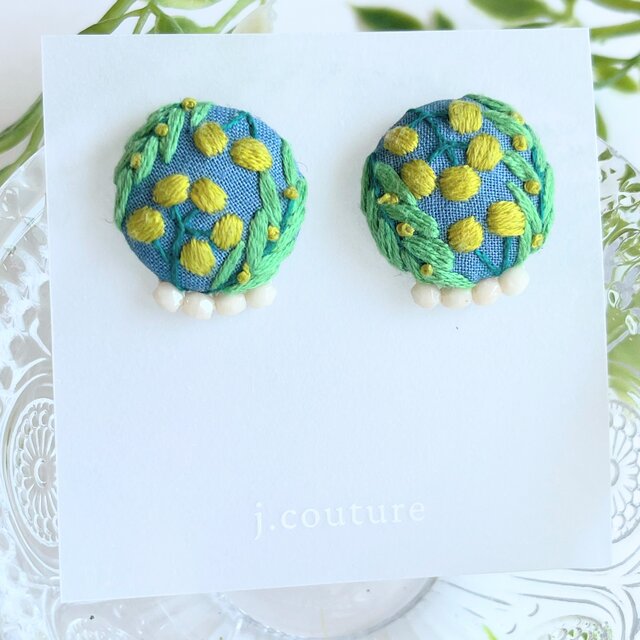 少しくすみのあるブルーのコットン地にミモザを丁寧に刺繍しました。