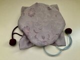 絹のきもの地で作ったお花の形の巾着です。表地はうす紫の地に花の織り柄が浮き出ていて、裏は無地の赤紫(花弁となっています)を使いました。色違いの紐で華やかさを添えました。