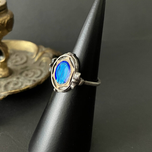 土台のリング部分の金属には銀を使用し、いぶし加工でアンティークスタイルに仕上げました。