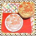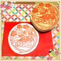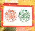 柔らかな円(毱)の中に彫りました。インクの色で雰囲気も変わります。