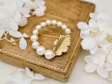 【ブローチ・Mサイズ】ヴィンテージなオークリーフとパールのリース