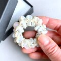 花びらのような形の真珠と小粒の真珠を使って、ふんわりと柔らかなフラワーリースをイメージして作りました。ハンドメイドの1点ものです。