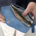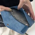 分離型札入れ: ファスナー付き小銭入れを挟んで、2箇所の札入れを用意。お札とレシートを分けて収納でき、会計時の動作もスムーズです。