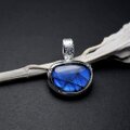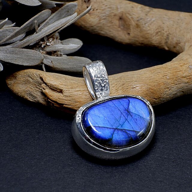 光の当たる角度によって、鮮やかなブルーの輝きが浮かぶラブラドライトをシンプルなペンダントに仕上げました。