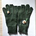 モスグリーンのオパール 毛糸で編んだ5本指ニット手袋に水仙のアップリケを施しました。右手の甲には水仙の花と葉を、左手の薬指には、水仙の花のイメージのリングを付けました。