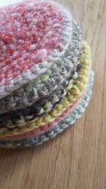 手紡ぎなので、まん丸ではありませんが、ポコポコと可愛い風合いのコースターです。