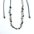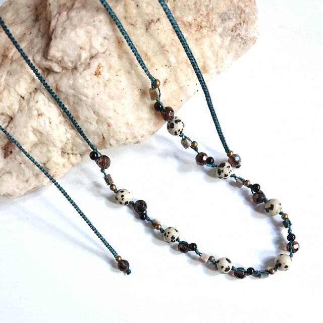 スモーキークォーツやキューブ型のジャスパーなどとともにダークグリーンのワックスコードで編み込みました。