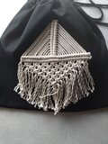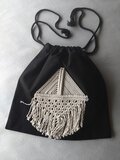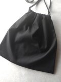 黒の10号帆布の巾着タイプのバッグに、フリンジのついたモチーフをつけました。