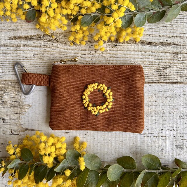 大人かわいい手刺繍ミモザリースの小さめポーチ カラビナ付き 国産帆布 ミモザ 小物入れ コインケース