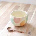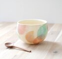 たっぷりの飲み物を受け止められるボウルの形に成形後、色とりどりの化粧泥を用いて刷毛目模様を施しました。