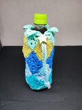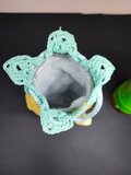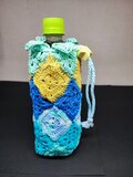 綿100%糸。ブルー色×黄色×グリーン色等6色使用。2種類格子柄、トレイス柄モチーフ繋ぎかぎ針編み。紐付き。星型止め付き。