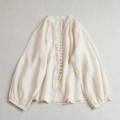 大人可愛いブラウスは、1枚でも可愛いですが、重ね着して、衿ぐりや袖口からフリルをのぞかせたり。