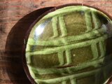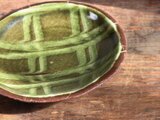 素地にクリーム状の化粧泥で模様を描いてから織部釉を掛けて焼成しています。