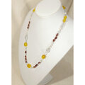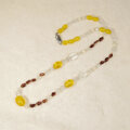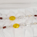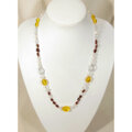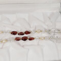 赤い色合いが明るく透明感も感じられる綺麗なガーネットと、美しい輝きと高い透明感の本水晶(多面カット)、ナチュラルカラーの本真珠(淡水パール)のネックレスです。