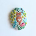 サーモンピンクの地に黒い花の刺繍、ありそうでなかったこの色のとりあわせ、すてきなブローチでした。