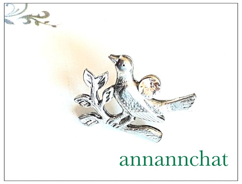 アメリカ製 ピューター素材 小鳥のモチーフ(シルバーカラー 23mm×12mm)に オーストリア製swarovskiを一粒キラリと輝く 小さなピンブローチを作りました。横幅 約21㎜です。