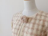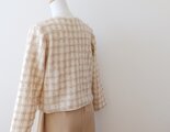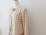 オフホワイトの地にピンクミックスの格子柄を家庭用編み機で編んだニットのボレロです。