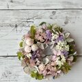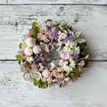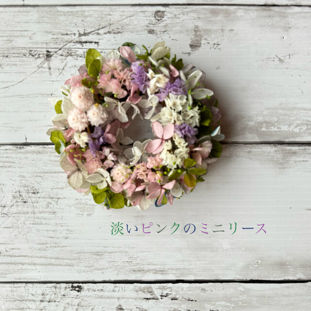 ごく淡いピンクのイモーテルやスターチスなどの淡いお色の花材で作ったとっても小さなリースです。