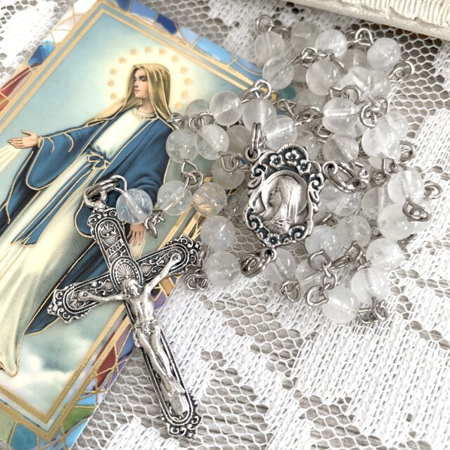 優しい印象の石に合わせてメダイやクロスも優しい印象のものを使用しました。