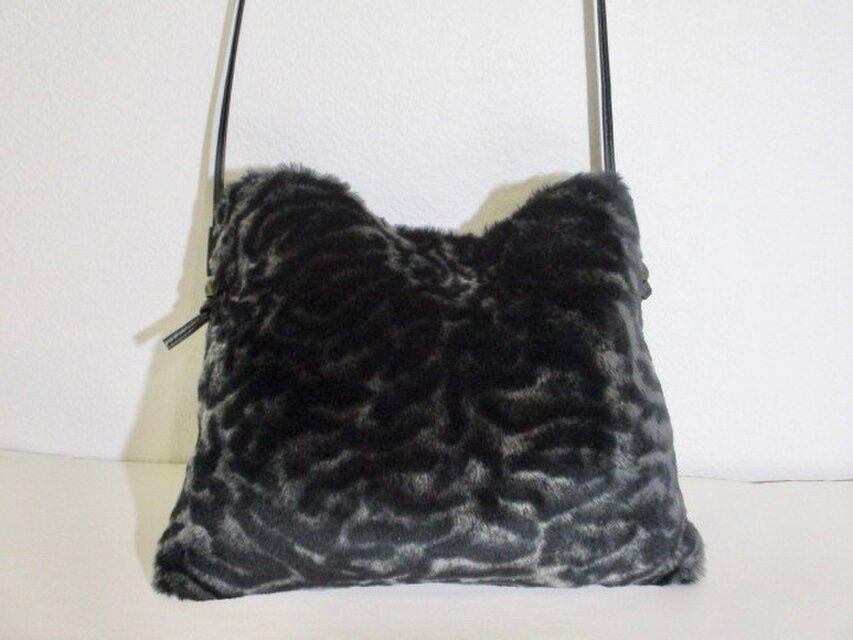 大好きP様オーダー品 まだら模様のムートンと豚革のポシェット(黒xグレー)