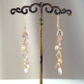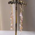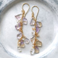 アメジスト(紫水晶)とシトリン(黄水晶)が混ざりあったバイカラーの水晶、ボリビア産、ラフスライスカットの宝石質アメトリンのピアス。 透明度の高い上質な原石で縁にもカットが入っており、動きにあわせてキラキラと輝きます。小ぶりの石をチェーンに留めたロングタイプのピアスでアクセントにハーキマーダイヤを2粒ずつ使っています。ベージュの小さな石は天然ジルコン。こちらもカットが細かく揺れ感がとても綺麗です。