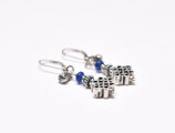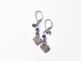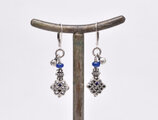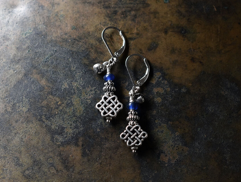エンドレスノットとブルーアンティークビーズ、インドシルバーの小さな鈴を繋いだピアスです。