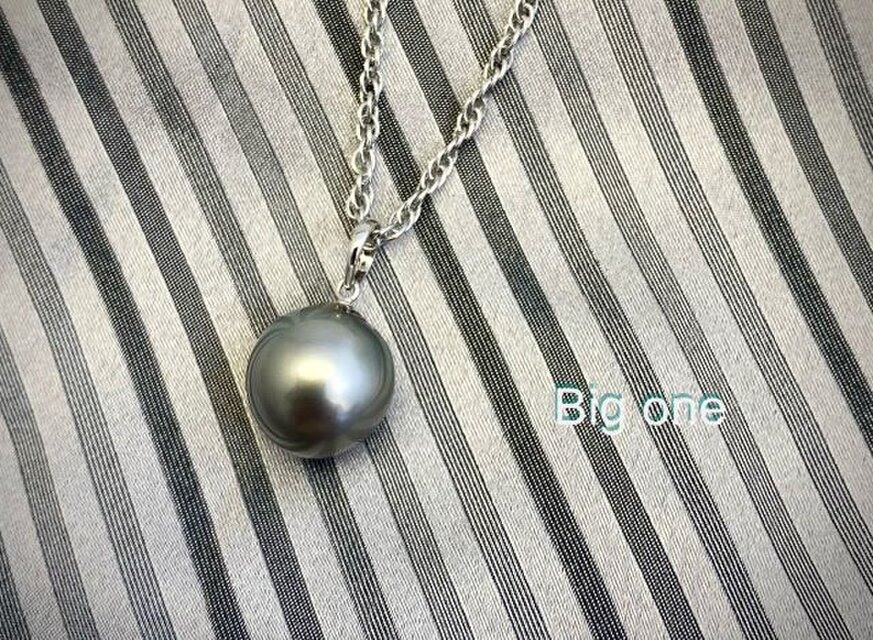 黒蝶真珠の「大っきいやつ」今回選んだのは黒蝶のスタンダードタイプ。淡いグリーンを帯びたグレーベースの重厚な一粒。シンプルなペンダントに仕立てました。ロジウムメッキをかけた70cm真鍮チェーンをお付けしてお届けします。