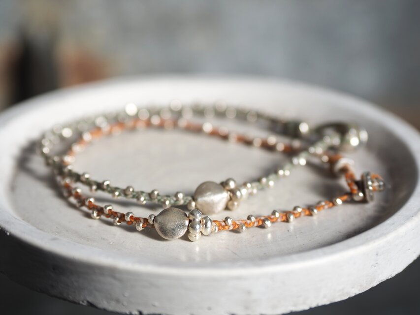 丸いシルバービーズをアクセントに無垢のシルバービーズを編み込み、紐の色をアクセントにした繊細なブレスレットに仕立てました。