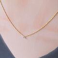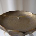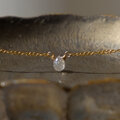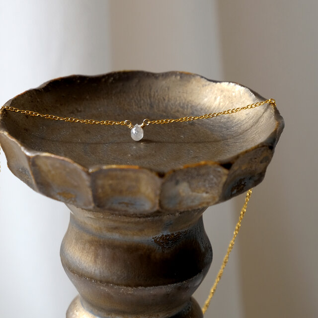 朝露のようなしっとりとした輝きが素敵なブリオレットカットのナチュラルダイヤモンドを一粒タイプのネックレスに仕立てました。シックな色合いのグレーカラー。ダイヤモンド特有の濡れたような輝きが素晴らしく、とても小さな粒ですが存在感があります。シンプルでさりげないデザインはフォーマルはもちろん華美なアクセサリーがつけられないオフィスでの装いにも。首周りは40センチ。トップが小さいのでアジャスターはありません。