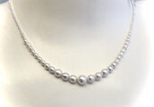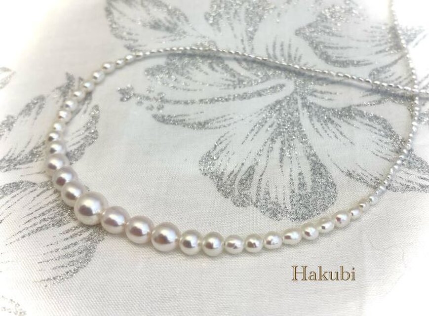 淡水無核白色ケシパールのネックレス。1.5~6.5㎜の細く長いグラデーションは整えられた白い眉のような風情で、正統派の美のオーラがあります。