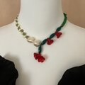赤いお花と葉っぱのようなビーズに、ポルトガル語で「歪んだ」を意味する個性的なバロックのルーサイトパールをあわせて、アシンメトリーなデザインのネックレスを作りました。