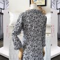 コットンリネンの薔薇柄フレアワンピース<A >『黒・前開き・綿麻・フリル&パール・八分袖』