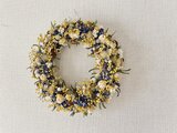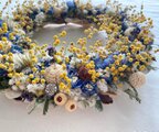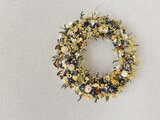 青いチドリソウや白い実など沢山あしらいリースにしました。