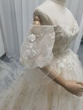 豪華!ウエディングドレス 薄シャンパンの色 キラキラグリッターチュール ふわふわ袖 抜群のおしゃれ見え