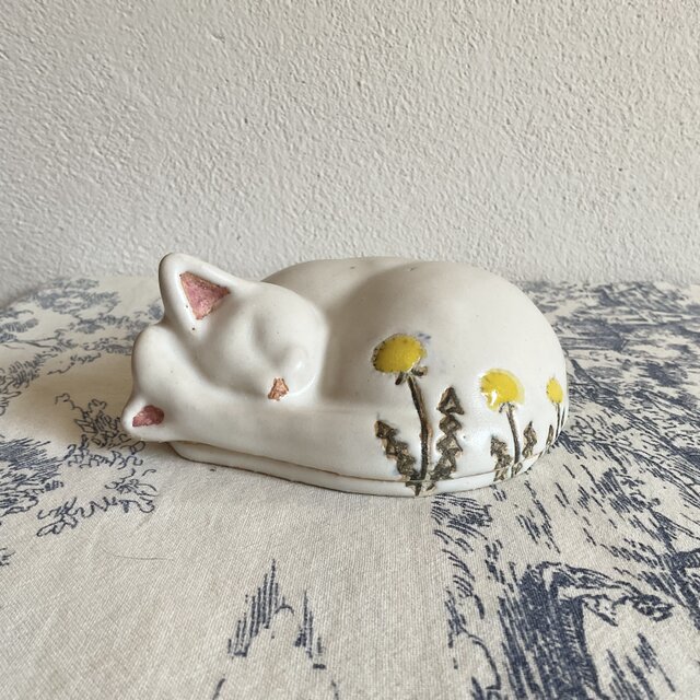 古信楽土を成形後素焼き後たんぽぽを描き、猫部分には白い釉薬、たんぽぽには黄色い釉薬をかけて本焼きしました。型があり、焼き上がりもだいたい同じように仕上がるので新しく焼けた猫を送ります。
