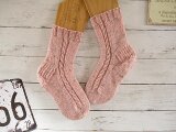 毛糸の特性上、左右で柄が違い靴下の側面1か所ライン状にケーブル模様を入れてます。