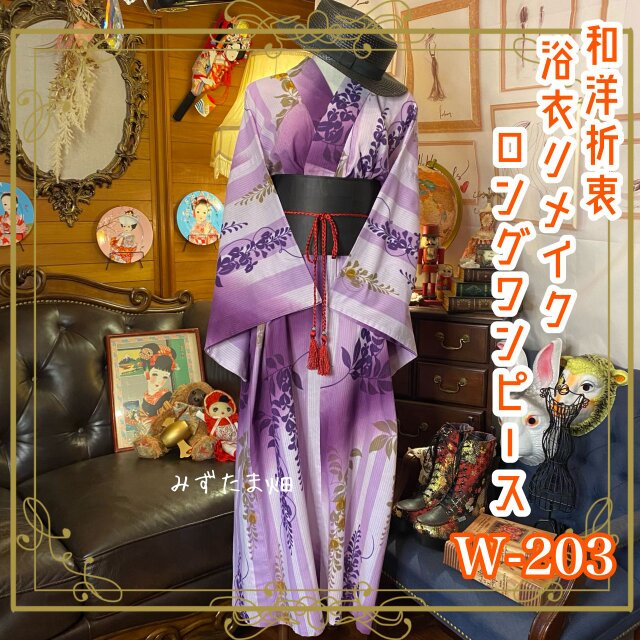 【 和洋折衷 レトロ 古着 浴衣 和 モダン ハンドメイド リメイク ワンピース ドレス 帯サッシュベルト 素敵なボタニカル柄×パープル×ライトパープル系 W-203 】