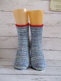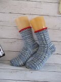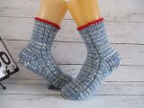 ドイツのブランド Lana Grossa Meilenweit Extrafine Stella 2534をメインにゴム編みの上部に Red をほんの少し入れて編んだ靴下です。