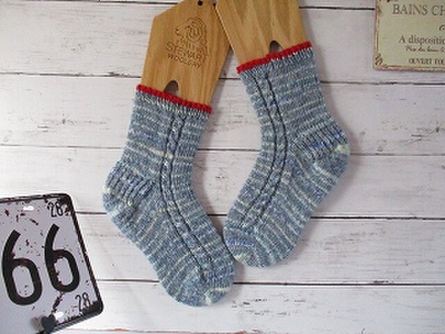 毛糸の特性上、左右で柄が違い靴下の側面1か所ライン状にケーブル模様を入れてます。