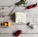 ダブルガーゼにプリントされた街を走る車。畳んだ面にいろんな様子がこんにちは。ワクワクします。