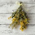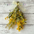 花材・・・ミモザ、ブルーファンタジー (ドライフラワー) リボン