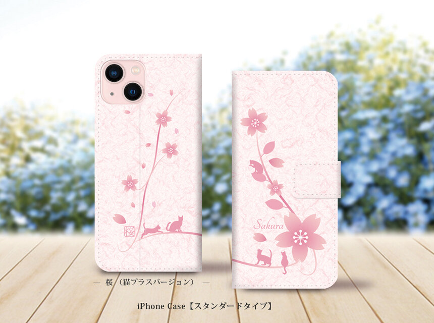 iPhoneスタンダード手帳型スマホケース (カメラ穴あり/はめ込みタイプ)【桜(猫プラスバージョン)】(名入れ可)