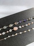ほんのりピンク色のモルガナイトをメインに、小さな石のお花を添えたブレスレットのシリーズです。