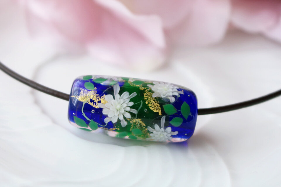 とんぼ玉のサイズは34mm×17mmです。重さは21gです。