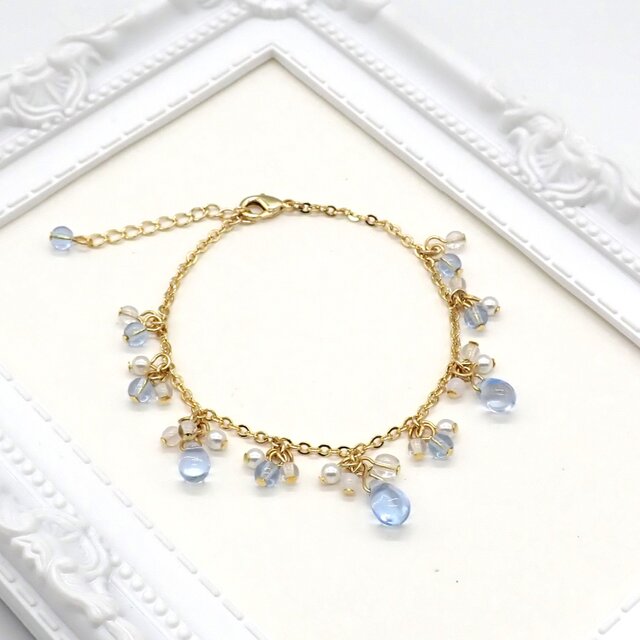 ライトサファイアのしずくビーズとチェコビーズの透明感のあるブレスレットです。