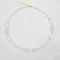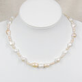 照りの美しい本真珠(淡水パール、セミバロック、ナチュラルカラー)のネックレスです。大粒のセミバロックと、ころころとした可愛い小粒の丸いパールを使っています。本真珠(淡水パール、ナチュラルカラー)の両耳ピアスとのセットです。