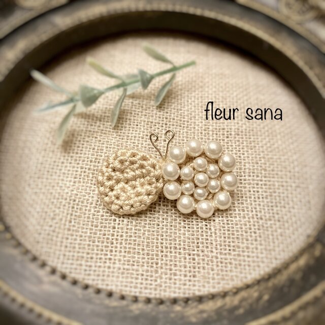 シルキーパールとレース糸のクロッシェで仕立てた、小さな蝶々モチーフのブローチです。