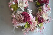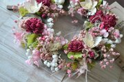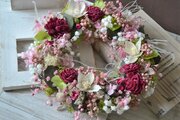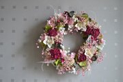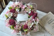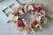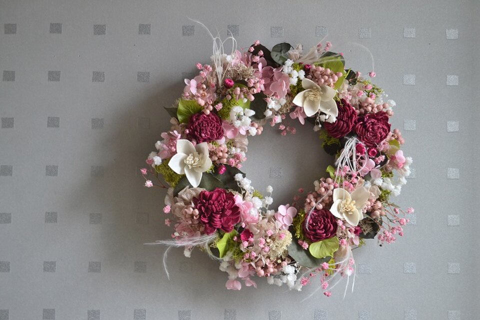 優しいピンクにアクセントの赤が効いた、ずっと長く飾れるリースです。
